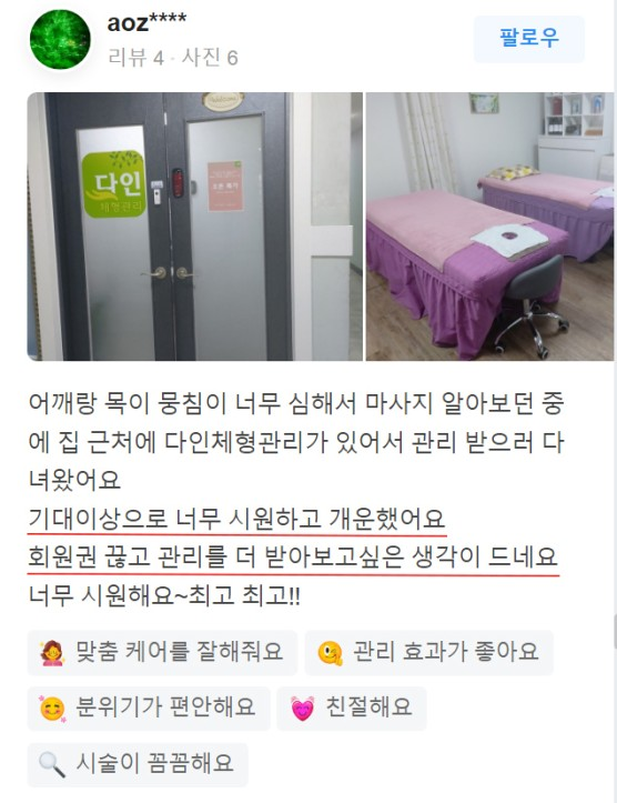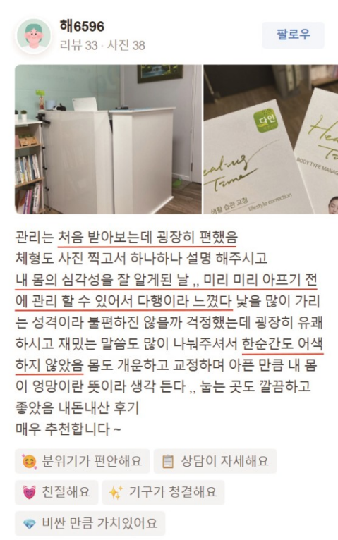 저말고도 다른분들도 관리를 받고 많은 체험후기를 남겨주셨더라고요. 그래서 더욱 믿음이 갔습니다.