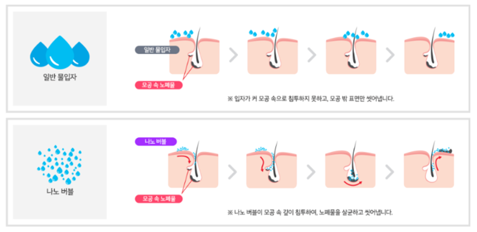 (피부 모공 크기: 250㎛ / 일반 물 입자 크기: 250㎛ /수소 나노버블 크기: 0.005㎛)