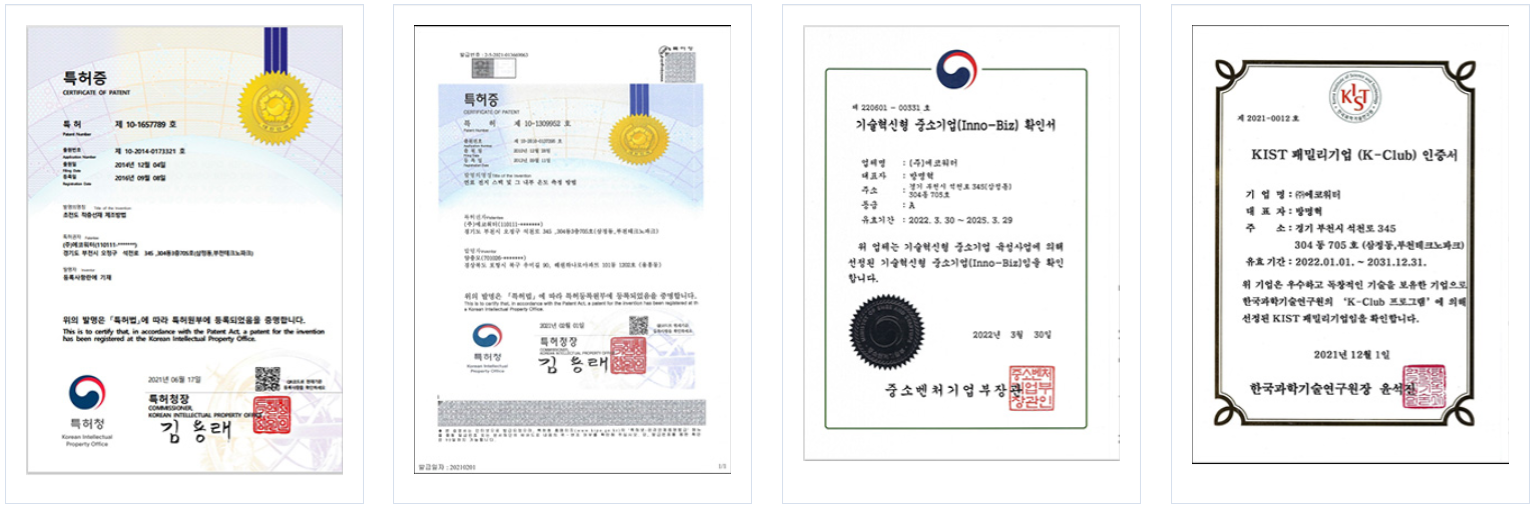 다음 여러 연구를 통해 다양한 시험성적서 및 특허를 보유하고 있습니다
